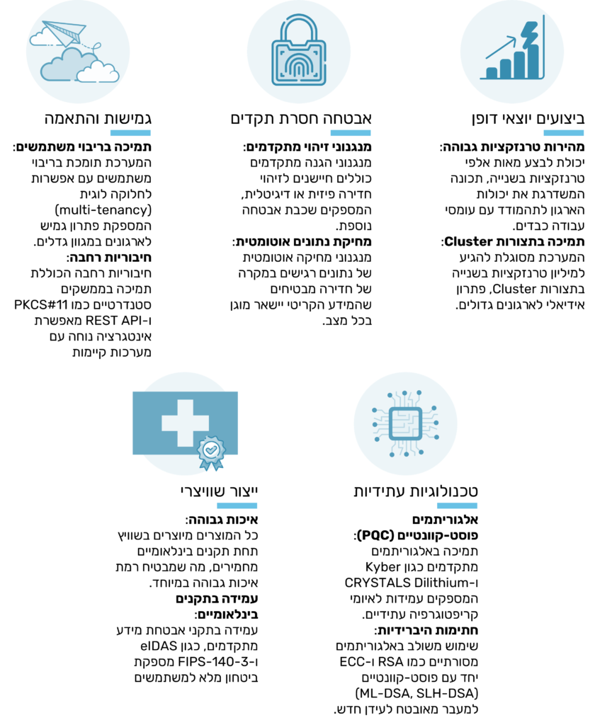| תמיכה באלגוריתמים | RSA עד 8192 ביט, ECC, AES, ופוסט-קוונטום. |